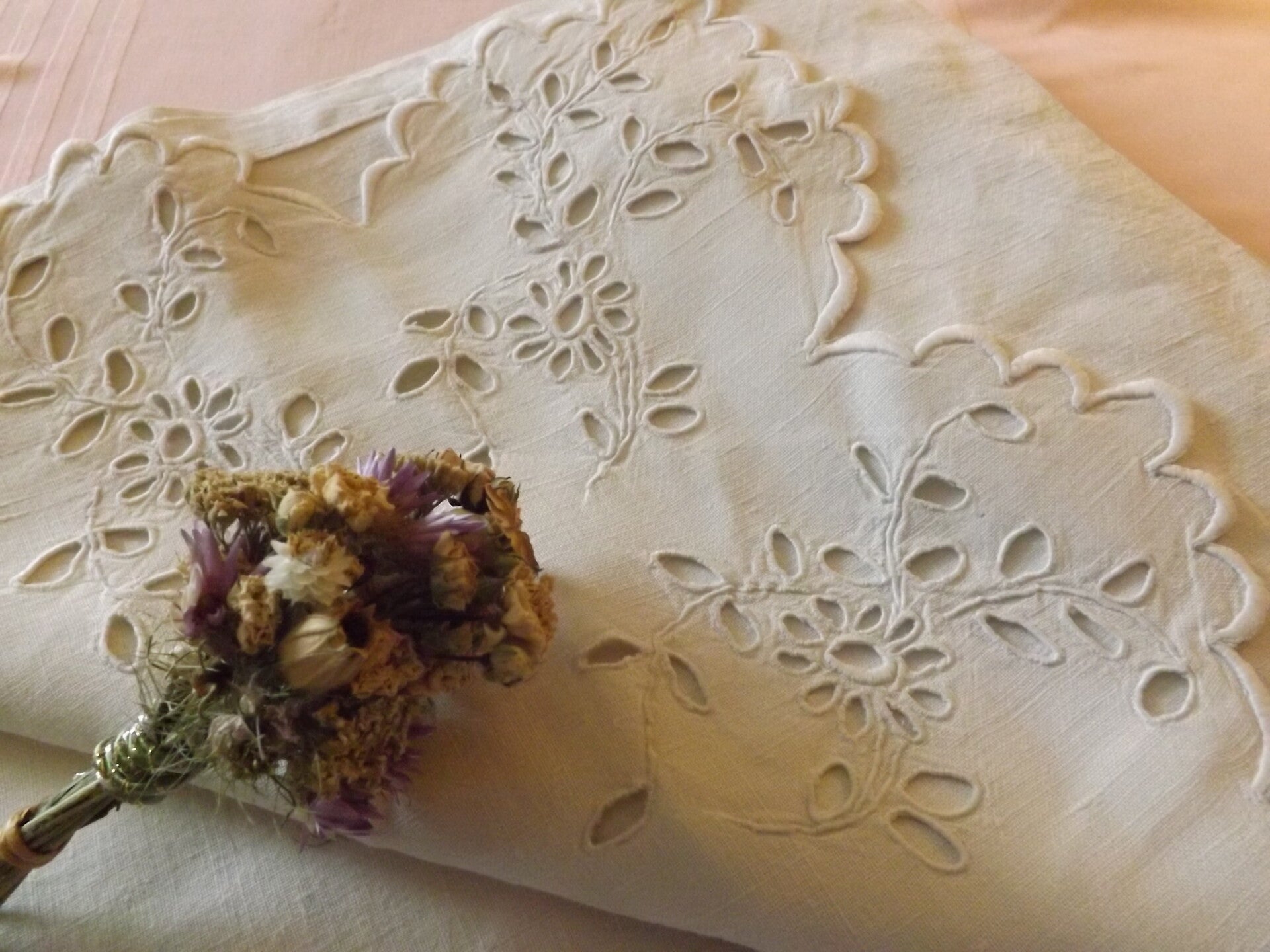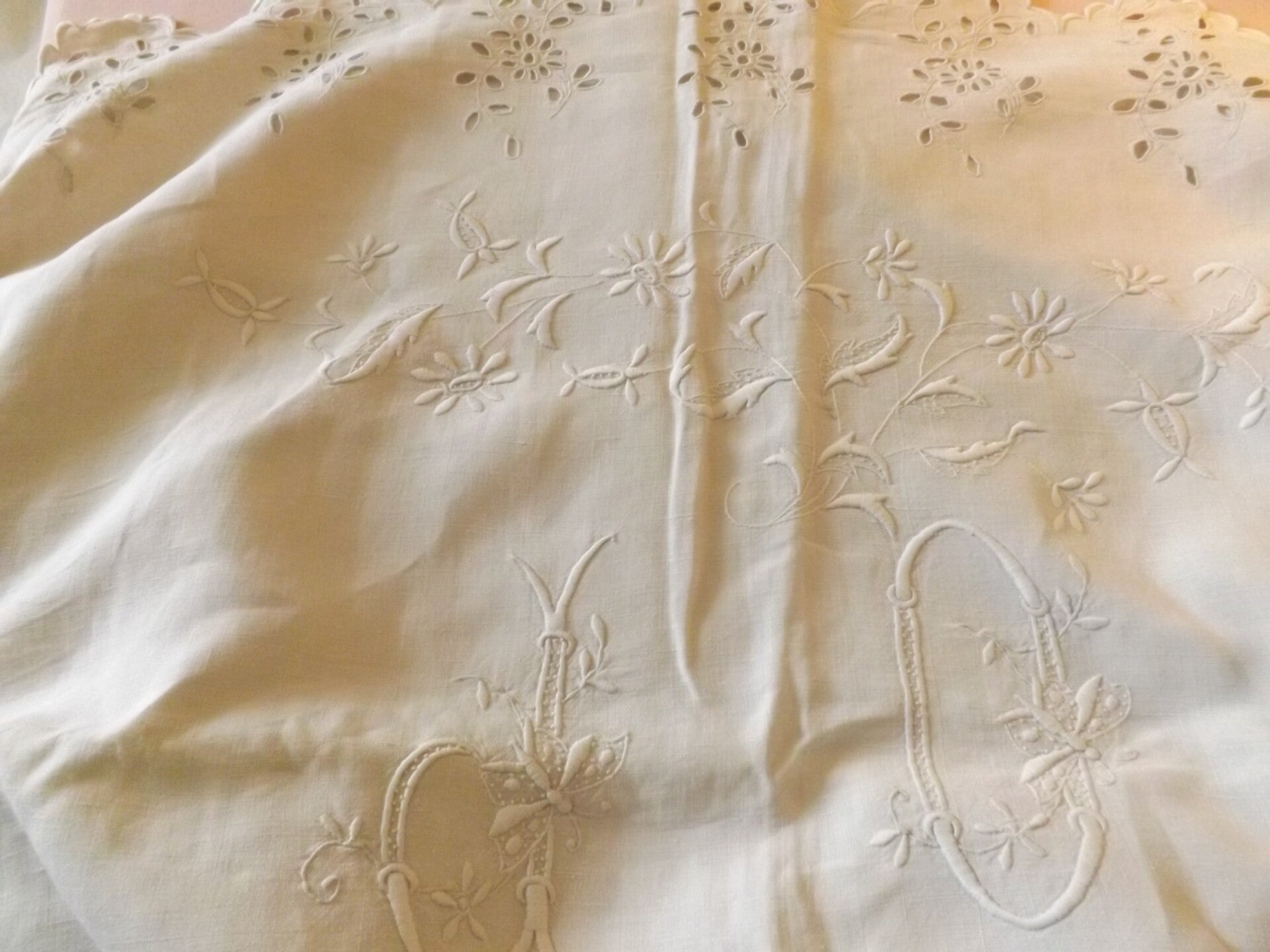 très beau drap en fil, beaucoup de broderies Richelieu ainsi que des festons également sur les retours. Largeur 2m