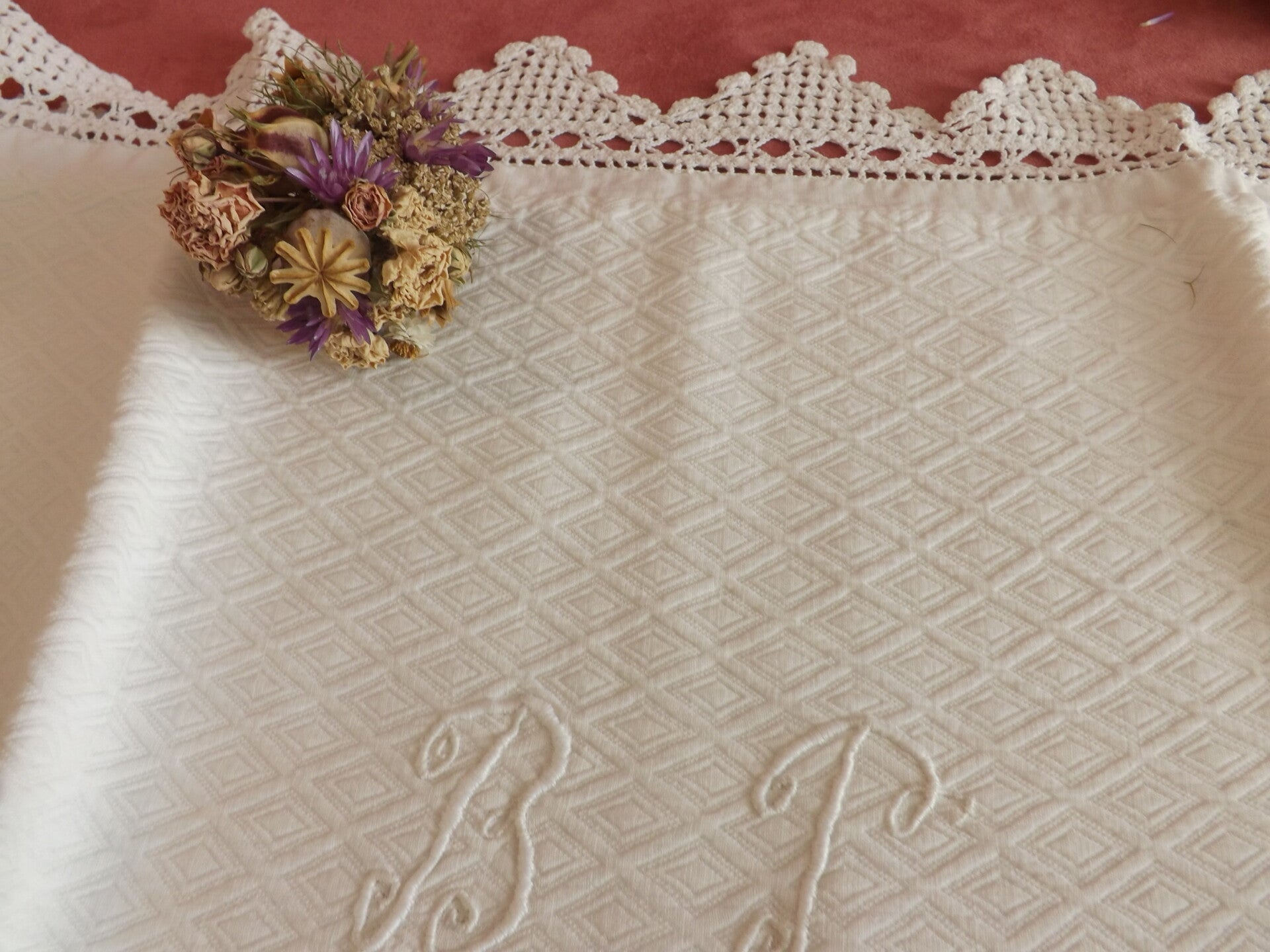 paire de taies d'oreiller carrées en piqué ancien avec monogramme.Le tour au crochet fait main.
