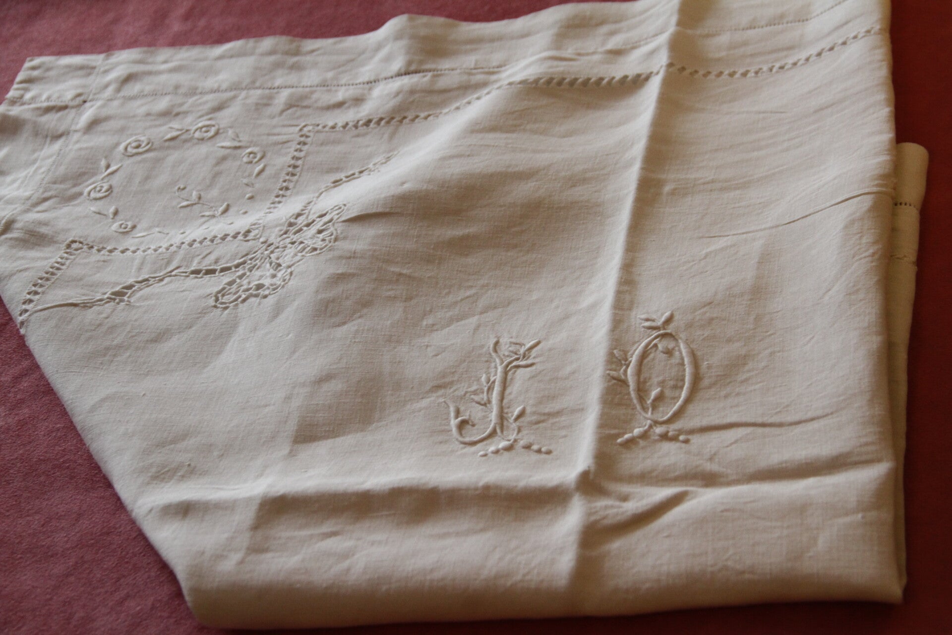magnifique taie en fil, brodée aux quatre coins, monogramme central