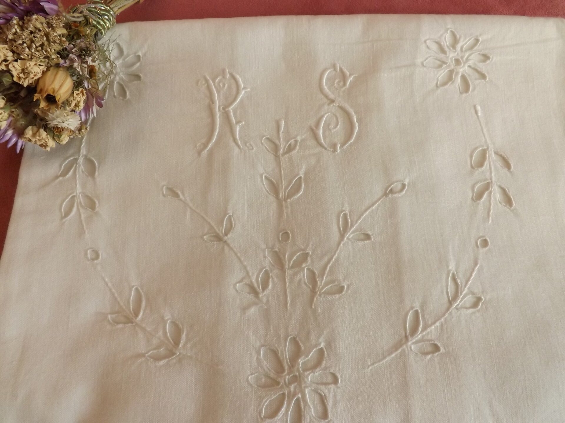 taie d'oreiller en coton, broderie centrale et tout le tour.
