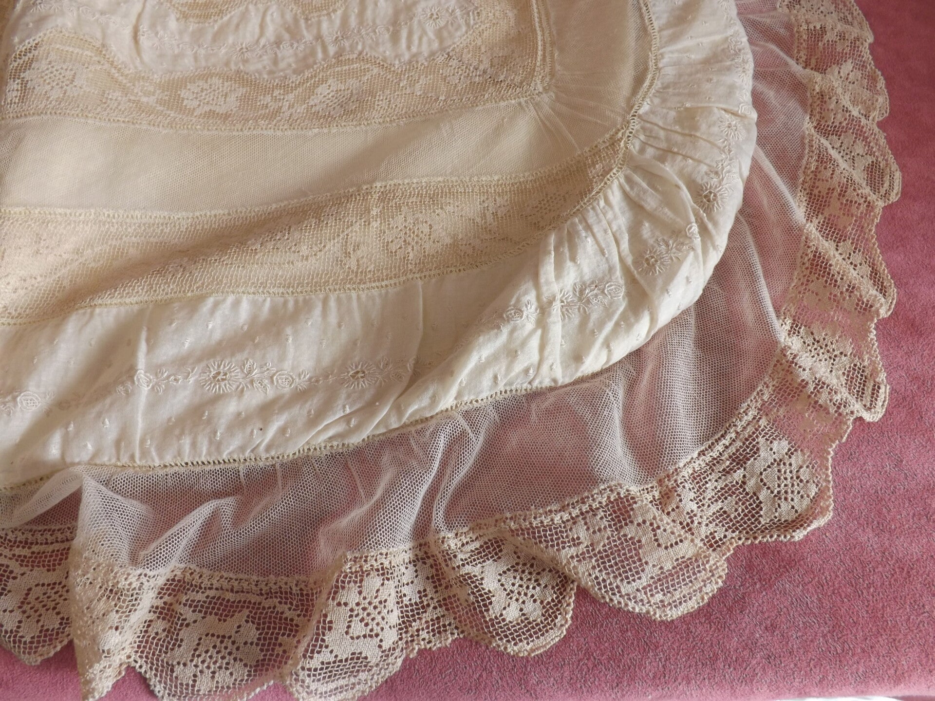 magnifique dessus de berceau fines broderies et dentelles sur soie.