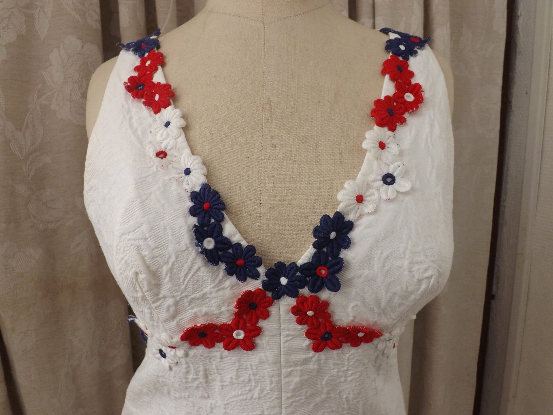 robe en piqué blanc des années 50. le haut agrémenté d'une guirlande de fleurs. Belle coupe et tissu de grande qualité, belles finitions. fermeture éclair dos, entièrement doublée.
